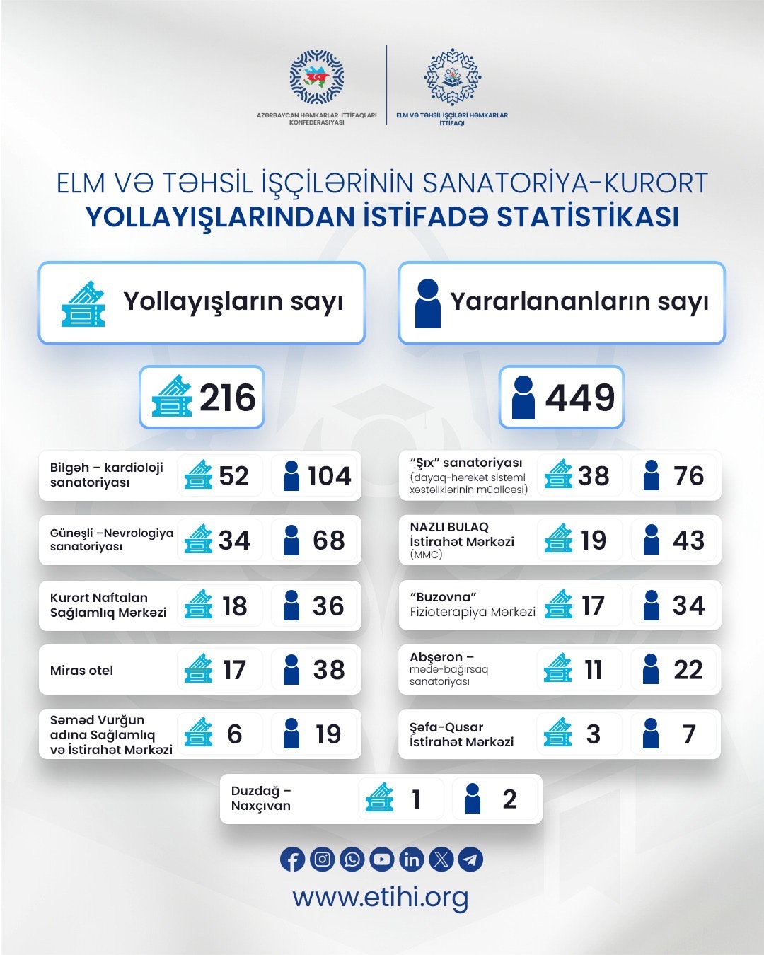 Sosial dəstək sahəsində də mühüm nəticələr əldə edilib. Sosial həssas qruplar daim diqqət mərkəzində saxlanılır. 2025-ci il ərzində 71 min nəfərdən çox ittifaq üzvünə mükafat və maddi yardımlar təqdim edilib. Yardımlar sosial həssas təbəqədən olan təhsil işçilərinin ehtiyaclarına yönəlib. Eyni zamanda cari il ərzində ümimilikdə 40 min nəfər olmaqla təhsil işçisi və ailə üzvləri sanatoriya-kurort müəssisələrində güzəştli şərtlərlə istirahət və sağlamlıq proqramlarından yararlanıb ki, bu da əvvəlki illərlə müqayisədə təxminən üç dəfə artım deməkdir.