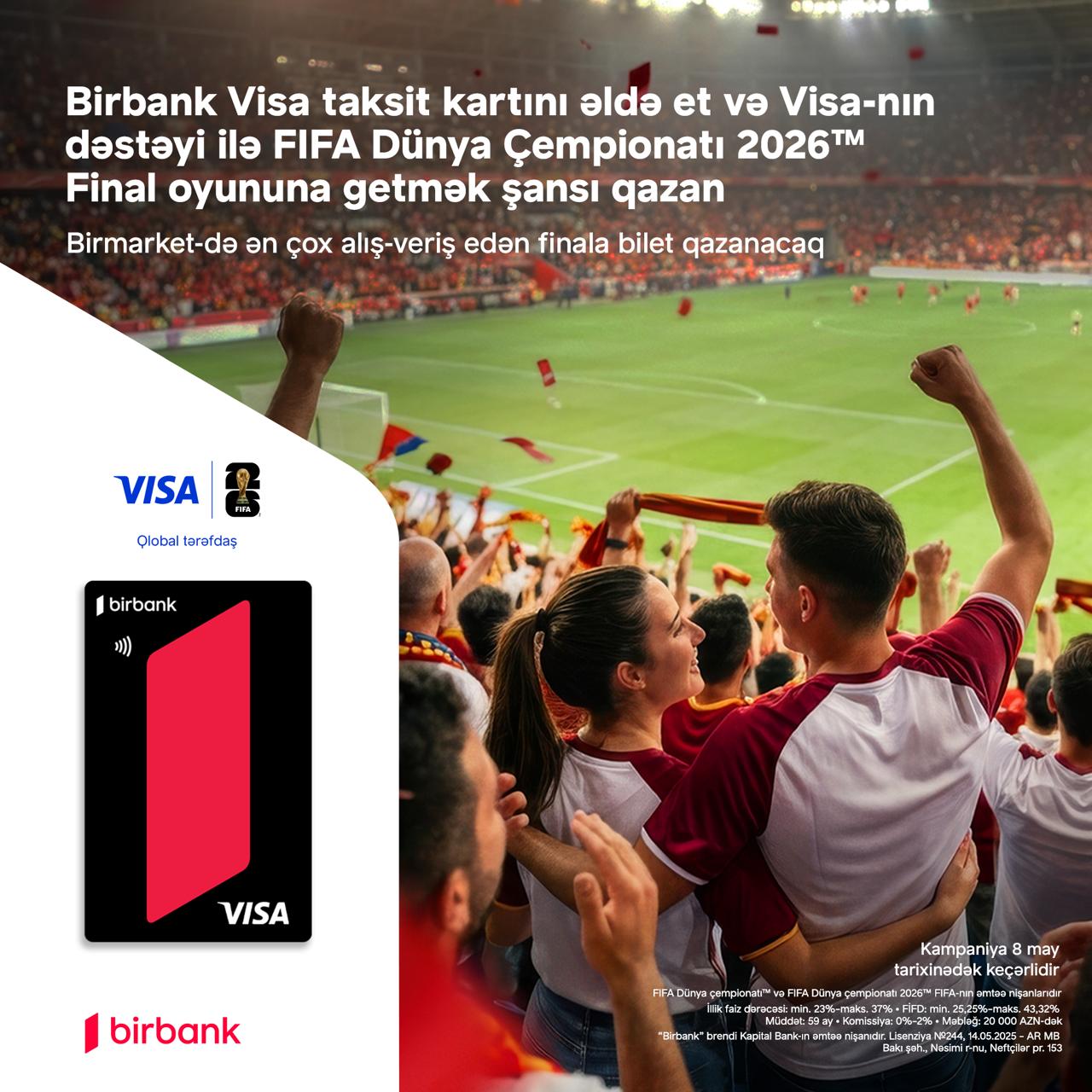 Ölkənin ilk rəqəmsal bankı Birbank, Visa şirkətinin dəstəyi ilə müştəriləri üçün daha bir unikal kampaniyaya start verir. “Birbank-la FIFA 2026 Final Oyunu” kampaniyası çərçivəsində Birbanklılar Amerika Birləşmiş Ştatlarında keçiriləcək möhtəşəm final oyununu yerində izləmək və futbol atmosferini canlı yaşamaq imkanı əldə edirlər.