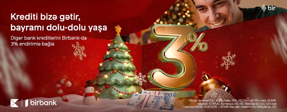 Sərfəli kredit axtarışında olanlar, bu xəbər sizin üçündür. Birbank digər banklarda kredit öhdəliyi olan müştərilər üçün əsl bayram hədiyyəsi edir. Belə ki, indi digər banklardakı kreditlərini Birbank-a gətirən hər kəs təyin olunan kredit faizinə 3% endirim qazanır. Yeni ili çətin maliyyə hesabatları aparmadan, büdcə sıxıntısı çəkmədən dolu-dolu yaşayın deyə bu şansı qaçırmayın.