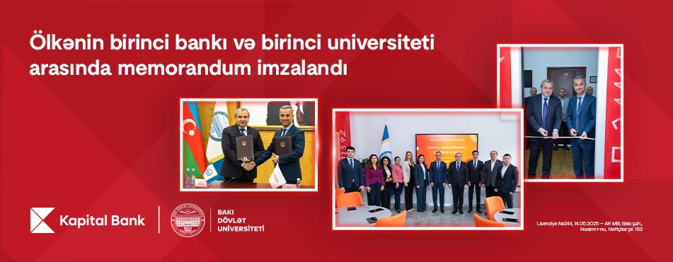 Ölkənin birinci bankı Kapital Bank və birinci universiteti Bakı Dövlət Universiteti (BDU) arasında əməkdaşlıq memorandumu imzalanıb. Bununla da Kapital Bank daha bir ali məktəblə strateji əməkdaşlığın əsasını qoyub. İmzalanma mərasimində Kapital Bank-ın İdarə Heyətinin üzvü, İdarə Heyəti sədrinin birinci müavini Cavid Mirzəyev və BDU rektoru Elçin Babayev iştirak edib.