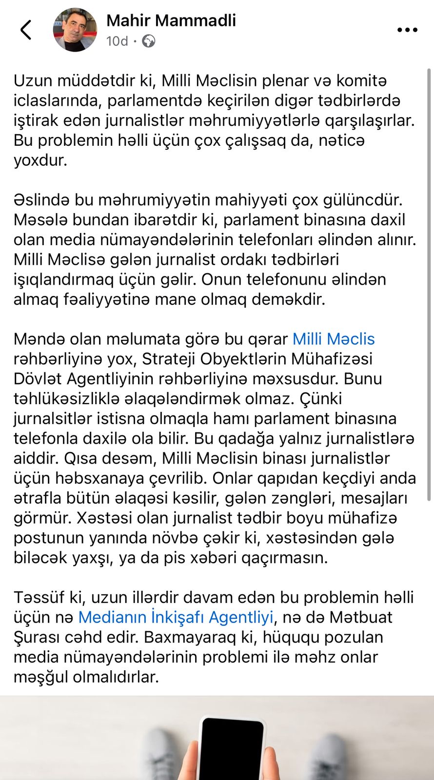 Real TV-nin əməkdaşı, tanınmış jurnalist Mahir Məmmədli, parlamentdə jurnalistlərin qarşılaşdığı məhrumiyyətlərlə bağlı sərt açıqlamalar verib. O, sosial şəbəkə hesabında bu məsələyə münasibət bildirərək, Milli Məclisin plenar və komitə iclaslarında, eləcə də digər tədbirlərdə jurnalistlərin telefonlarının alınmasını qınayıb. Mahir Məmmədli, uzun müddətdir davam edən bu məhdudiyyətin həlli üçün heç bir addım atılmamasına da narazılığını bildirib.