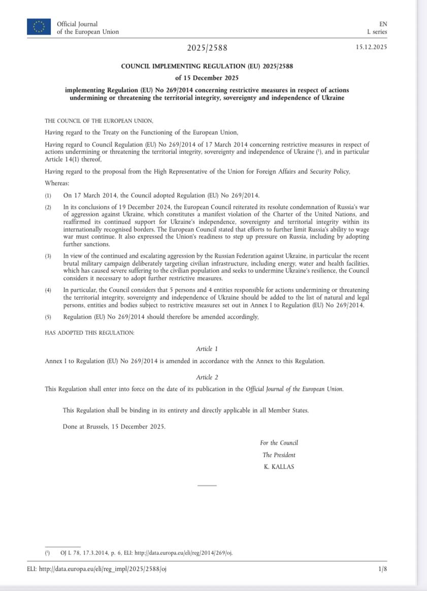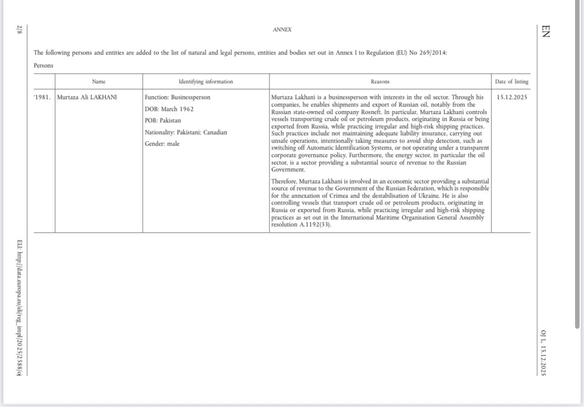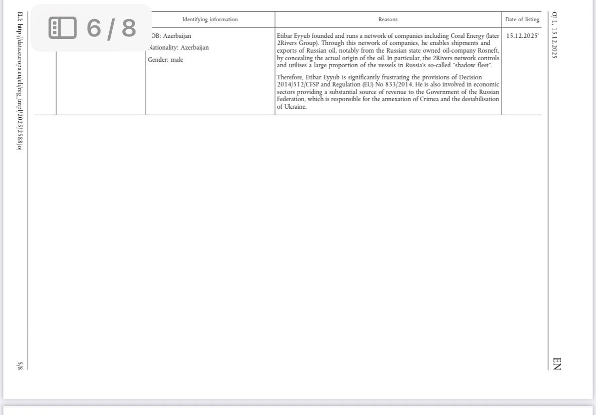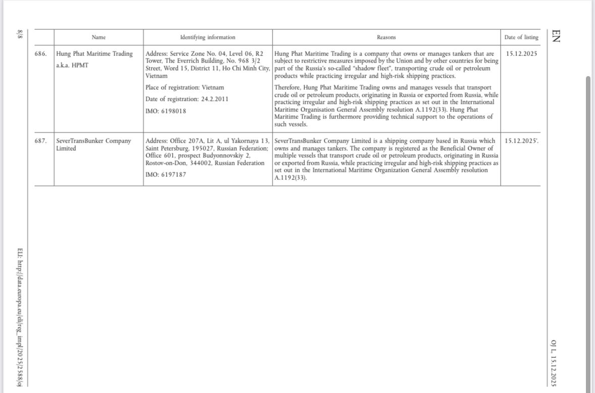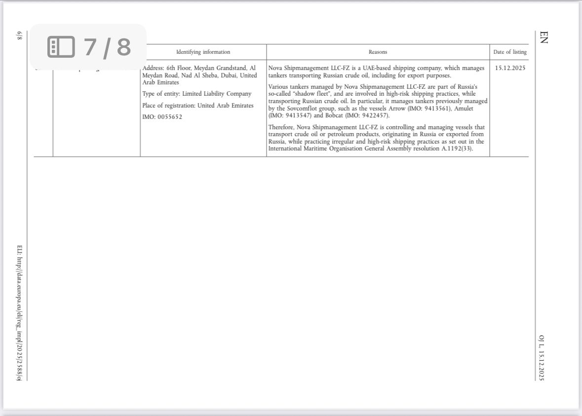 Aİ Şurası 15 dekabr 2025-ci il tarixində beş iş adamına və dörd gəmiçilik şirkətinə sanksiya tətbiq edib. Qərar Rusiya xam neftinin mənşəyini gizlətməkdə iştirak edən və Aİ rəsmilərinin “qeyri-müntəzəm və yüksək riskli gəmiçilik təcrübələri” kimi qiymətləndirdiyi fəaliyyətlə məşğul olan əsas operatorları hədəf alır.