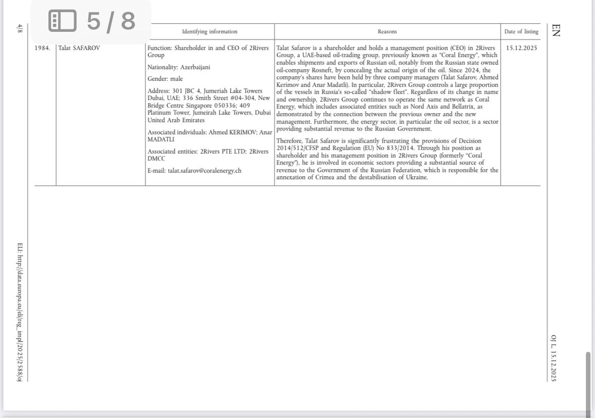 Sanksiya siyahısına Pakistan–Kanada mənşəli iş adamı, Rusiya neft məhsullarını daşıyan gəmilərə nəzarət edən Murtaza Əli Ləxani, eləcə də əvvəllər Coral Energy kimi tanınan 2Rivers Groupun rəhbər şəxsləri — baş icraçı direktor Tələt Səfərov və səhmdar Anar Mədətli daxil edilib. Aİ qurumlarının bildirdiyinə görə, 2Rivers şəbəkəsi Rusiya neftinin daşınmasında əsas vasitəçilərdən biridir və yükün mənşəyini qəsdən gizlədən çoxsaylı gəmilər istismar edir.