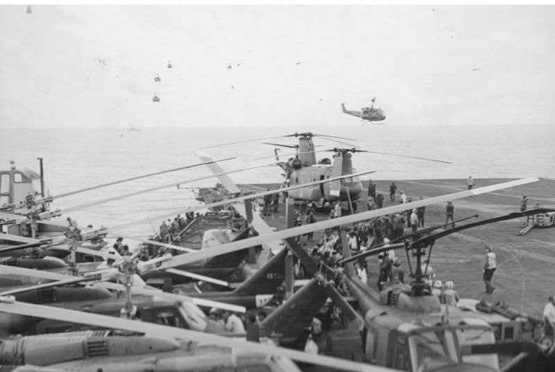 Aprelin 29-da “Midiuey”ə enən ilk helikopter Cənubi Vyetnamın aviasiya marşalı, bir müddət vitse-prezident vəzifəsini tutmuş Nquen Kao Ki oldu. Onun ardınca başqa helikopterlər gəlməyə başladı. Onlar eniş üçün növbəyə durmalı olurlar. Tezliklə gəminin eniş zolağında xeyli helikopter yığılır.