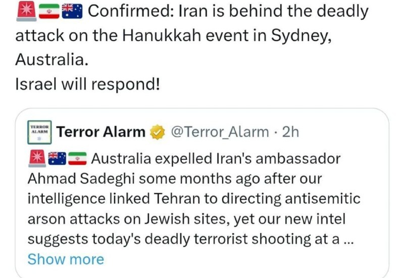 “Təsdiqləndi! Avstraliyanın Sidney şəhərində Hanuka mərasiminə edilən ölümcül hücumun arxasında İran dayanır. İsrail buna tədbir görəcək!”.